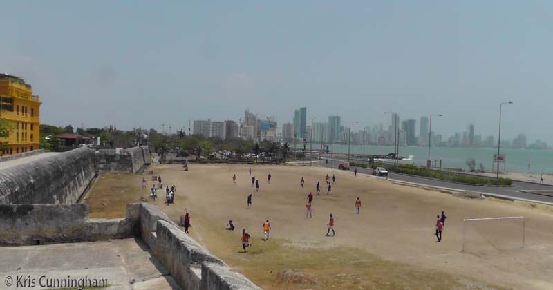 We climbed up to walk along the wall, and looked down on a field of people playing soccer.
