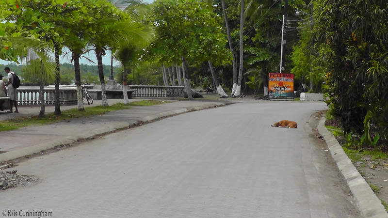 This is one of the few paved roads and the main road along the water. This pretty much sums up the pace of the town, this dog sleeping in the road. People just drove or biked around him.