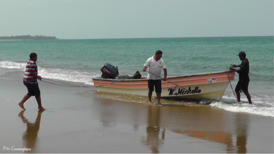 Our boat captain Edwin (white shirt) brings our boat back to shore with the help of a couple waiting assistants. Once we were out of the boat, they tied it to a rope from a truck up above and dragged it up on the sand.
