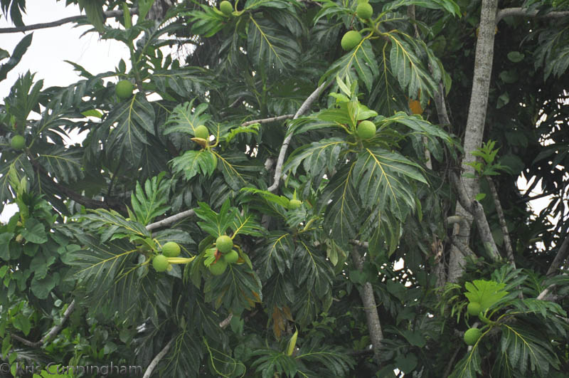 I think these are breadfruit. We have jackfruit here which are similar but bumpy, and these fruits are smooth. There were quite a few trees in town but I didn’t see the fruit for sale. One of these days I want to try it.