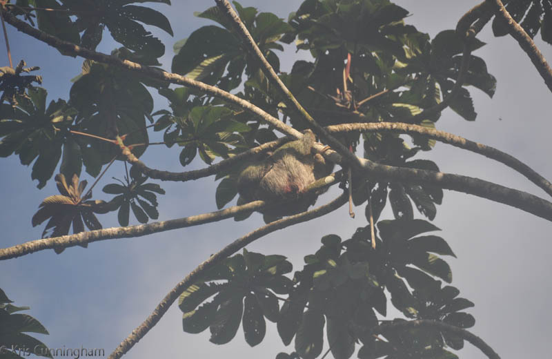 I got lucky one morning and caught this sloth in the tree with the light hitting her (we know it’s a her because she is one of the moms)