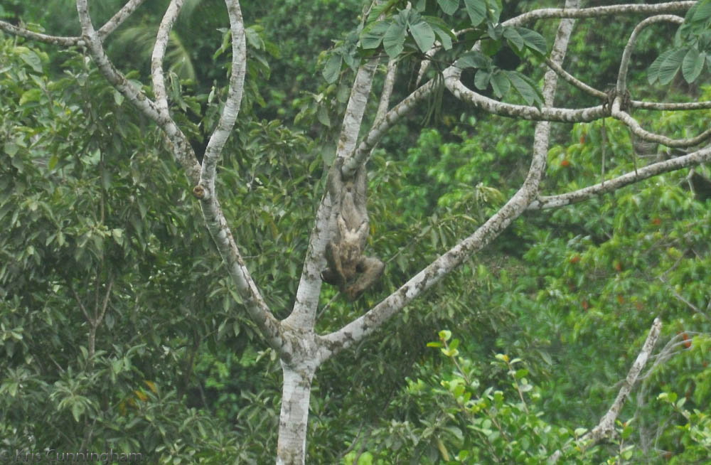 A very lucky shot! The sloth stretched her front legs overhead (or underhead since she is upside down) just long enough to get a good shot of the baby hanging on to her belly.