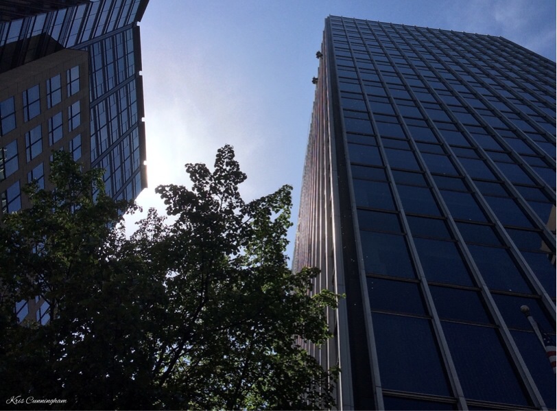 I sopped on this corner and got sprinkled with water. When I looked up I realized it was from the window washers up there. There was enough water coming down they must have had a hose or something.