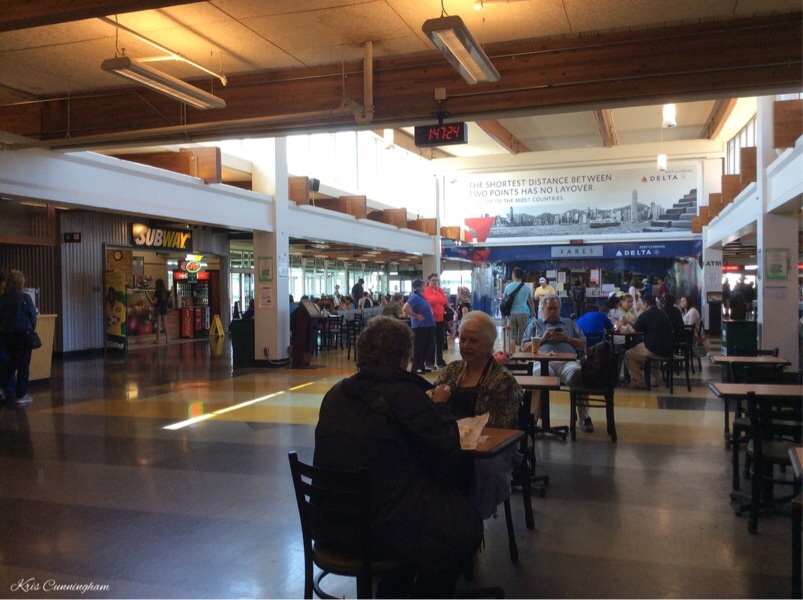The ferry terminal has lots of places to eat and sit.