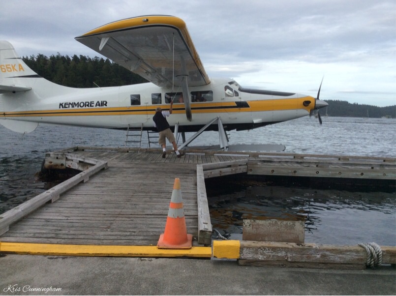 The plane arrives, and the guy pulls on the ropes to coax it to the dock.