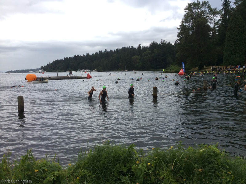The event started at 6:30 AM! Some of the participants are getting a feel for the water while the first wave of competitors lines up farther away. Each category had different colored caps and left in groups 10 minutes apart, so after a while there were swimmers everywhere. There were two races, the Olympic which went first, and then the sprint which was for shorter distances.