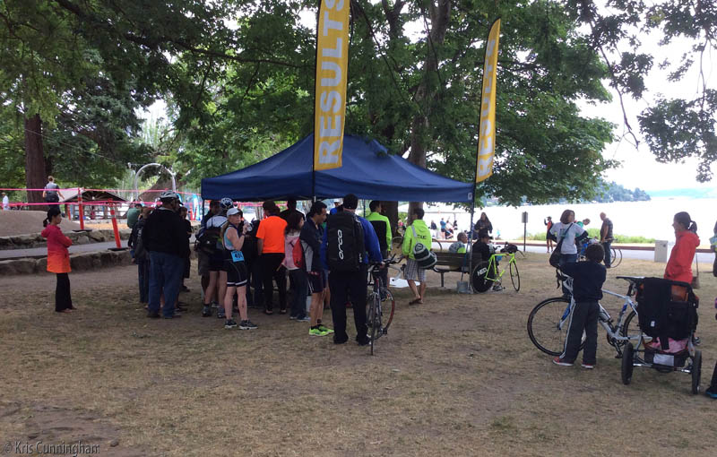 There is a crowd gathering at the results tent, but no results until they make sure the computers recorded everything correctly. Everyone has a computer chip so their times are recorded at various points and at the finish.