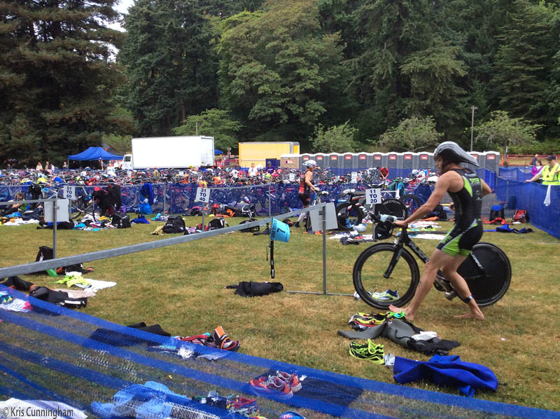 Many wet suits are now hanging on the lines as swimmers have left on their bicycles. One of the leaders has completed his bike ride here and is going to grab his running shoes. The bicycles had pedals that clipped to shoes, and many contestants left their shoes clipped to the bike pedals to make the changes faster.