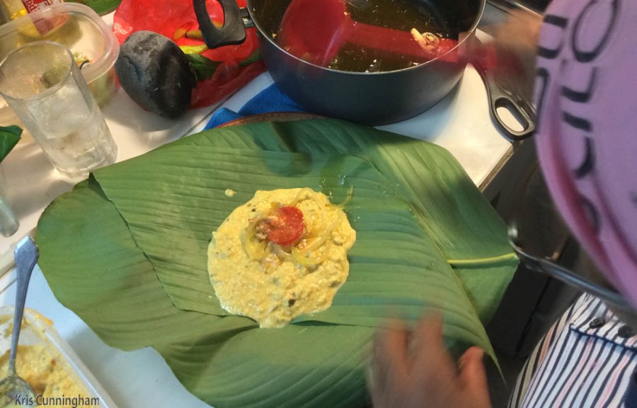 Garnish on top, and ready for folding (this is from the first batch with only bijao leaves)