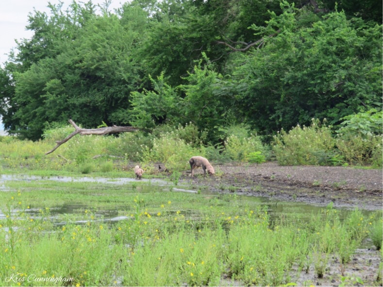 Pigs enjoying themselves at the edge of the water