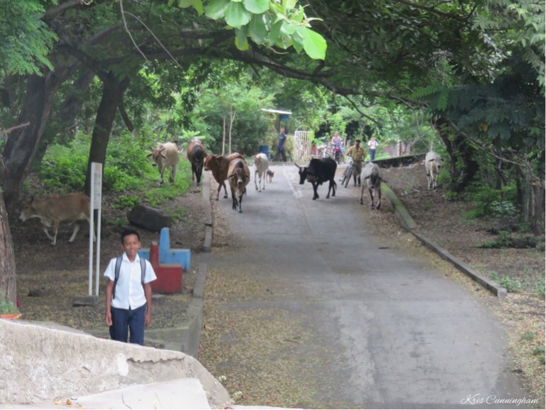I wait in front of the school while the kids are arriving among more cows on the move.