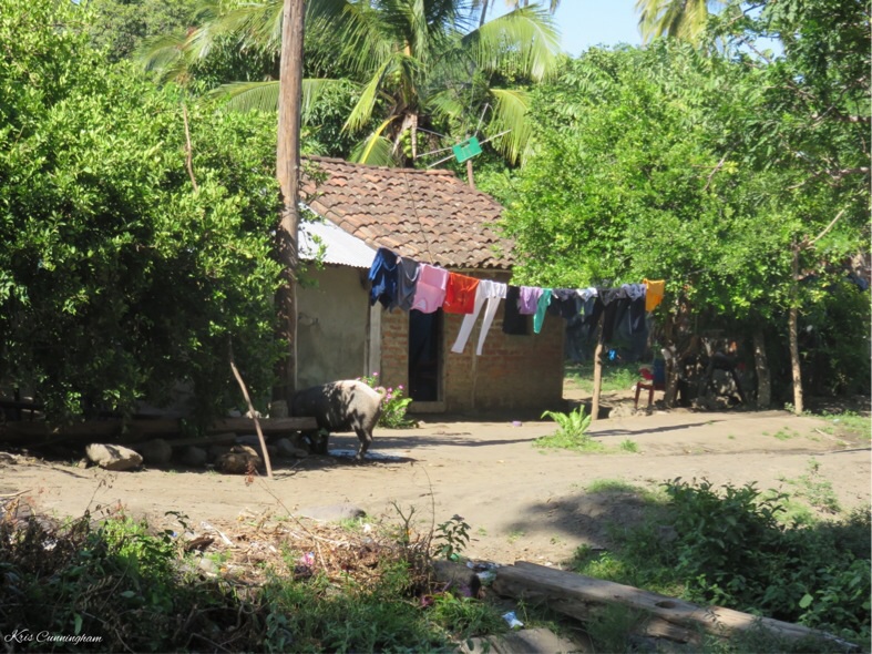 Cute little house with a pig out front scratching it’s head on the pole.