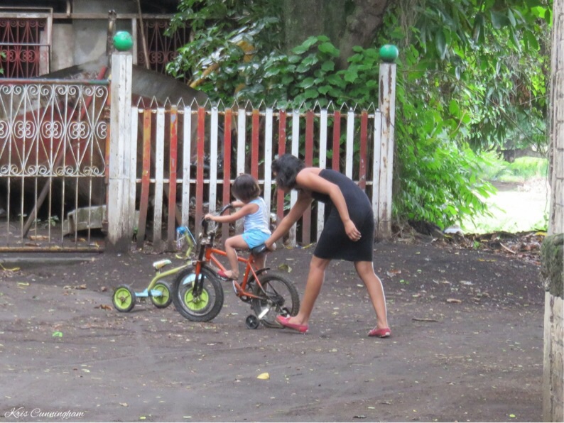 A mom teaches her little girl to ride a bicycle.