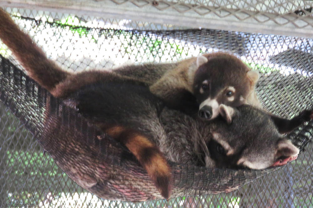 A coatimundi was so cute cuddled in the hammock with a raccoon.