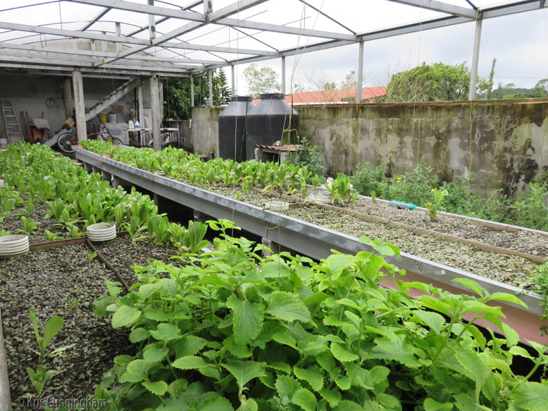 The hydroponic garden has herbs and a lot of lettuce.
