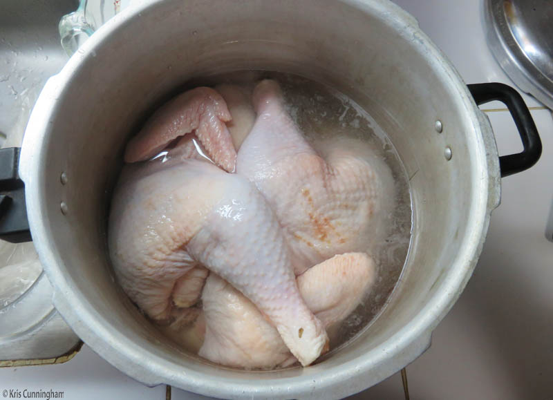 I just tossed the chicken in the pot whole, skin and all. This is two of those big half chickens, but we had enough left over chicken that I think one would have been enough.