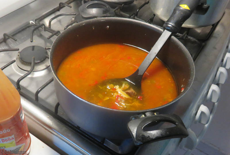Broth warming on the stove with some bits of meat and veggies that were cooked with the chicken. We ended up using about half of this (maybe 3-4 cups). The rest made a great soup later.