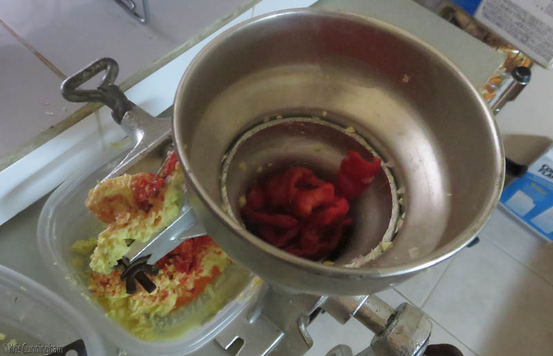 Cedo tossed a couple handfuls of seeded and cored peppers in the grinder.
