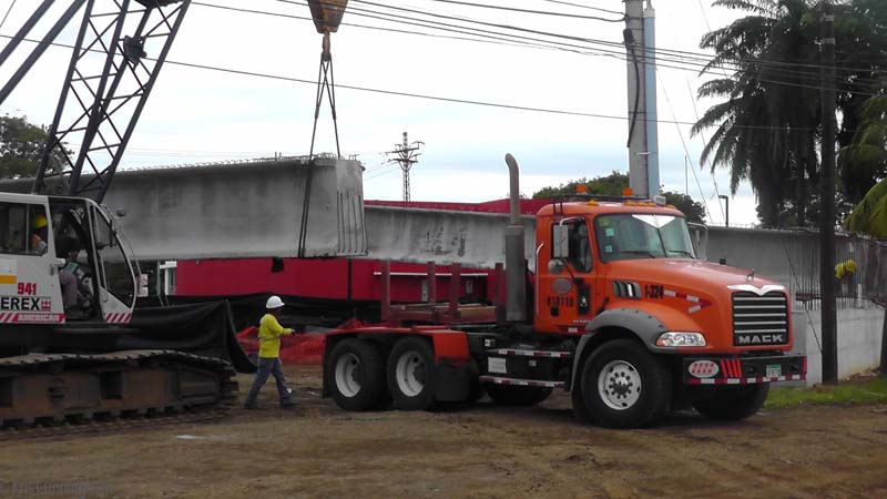The beams are then lifted off the trucks on either end by two cranes.