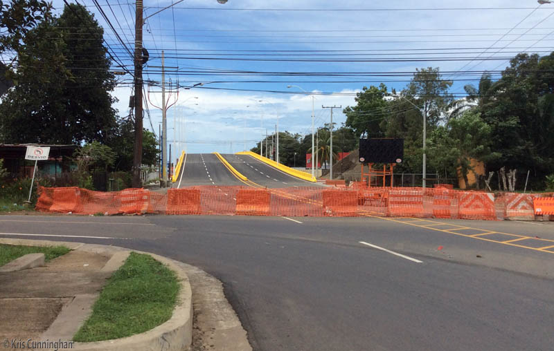 It sure looks done, but it still isn’t open. We saw later that they also installed barrier in the medians to prevent turning left on to the bridge for a few blocks on either side.