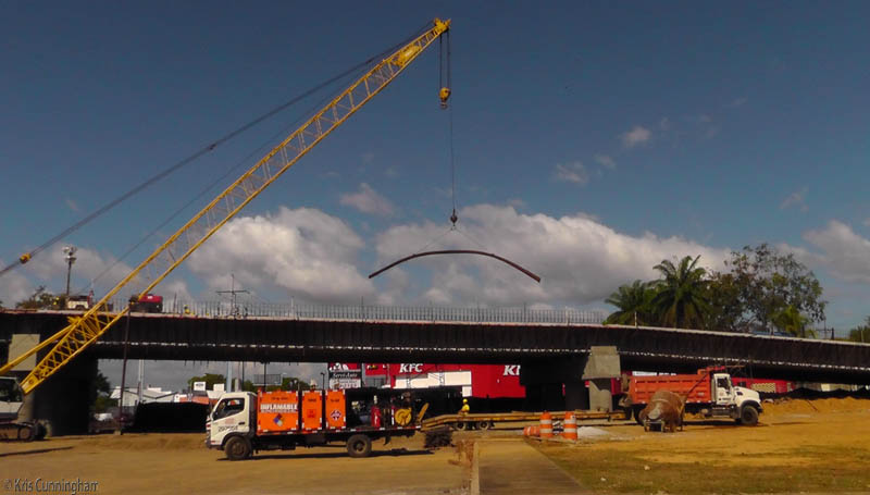 The cranes were kept busy bringing up equipment and materials. Here a big bundle of rebar is being lifted up to the bridge.