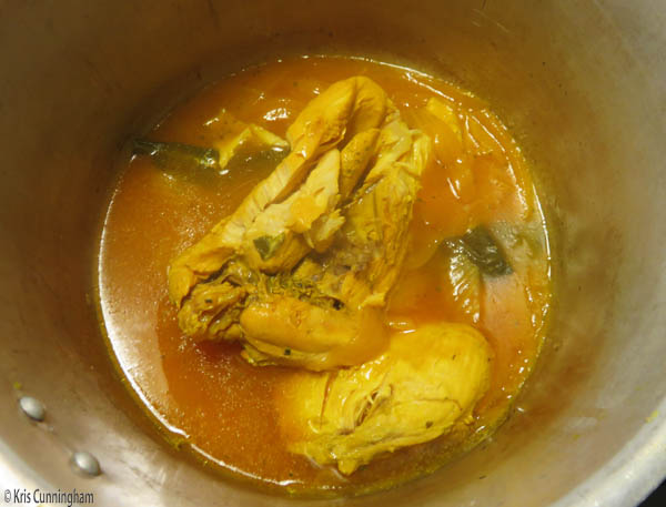 Cook the chicken with onion, garlic, Maggi builion, culantro, and a package of tomato sauce
