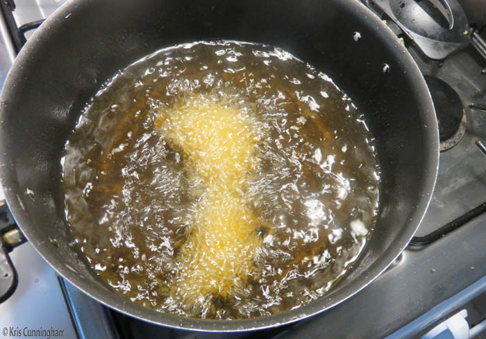 Fry them in enough oil so they can float freely, and don’t crowd them in the pot. She tested the oil by dipping in an end of an empanada and if it sizzled, the oil was hot enough.