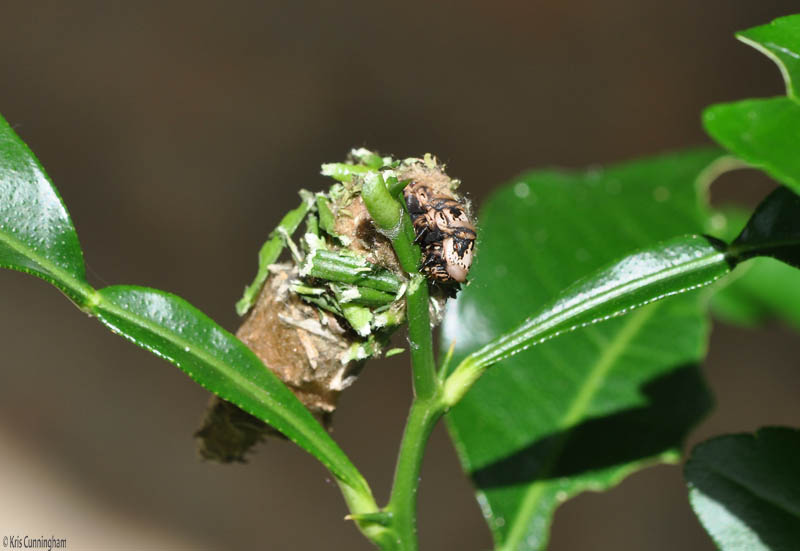 Things got more bizarre from there! Next, I found it cutting of pieces of stem and sticking them to its cocoon.