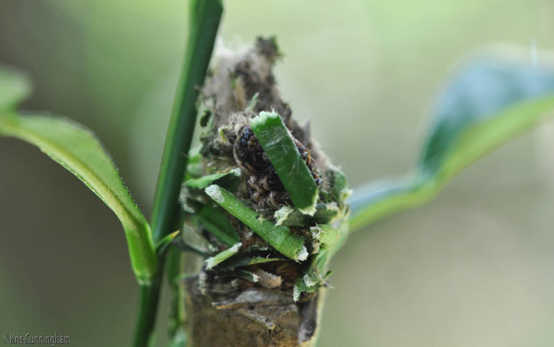 The cocoon is covered with more and more pieces of stem. It almost has this one in place.