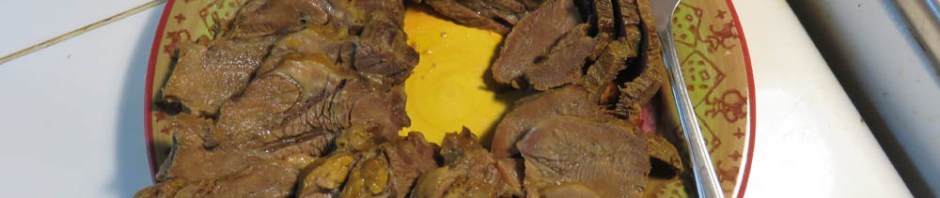 First, it must be boiled for 5-10 minutes, and then the skin removed. That is quite a bit more difficult than one would think! (I was told if the skin isn’t removed it becomes impossibly hard and tough when cooked more) Then, make a salsa like the one for the Lomo Relleno – celery, onion, green pepper, Maggi bullion cube, garlic, and any other seasonings you like whirled in the blender. Pour this over the meat and it is ready to cook.