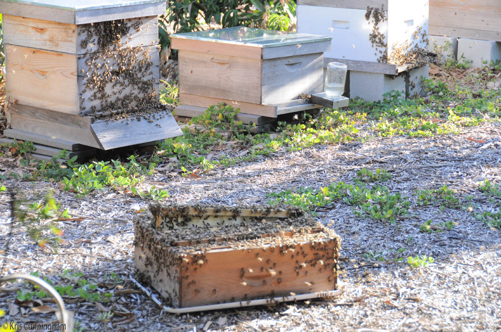We did see a lot of honey bees though, and a swarm actually moved into the siding of our house. This was the beginning of my experiences with beekeeping. I’m not sure what I was doing here. I think I had put out a box after collecting the honey so the bees could clean it up. I see a box in the background with a bottle of sugar water so that must have been a new colony I just put in and didn’t have it’s own honey supply yet.