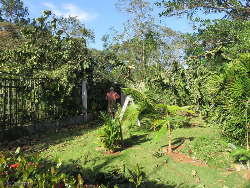 We spent the afternoon sawing and cutting and hauling pieces to the woods behind the house. As the yard was cleared I could see that my pretty coconut tree and the plantains were damaged but should recover. I might have lost a yuca or a pineapple plant, but both are easily replaced.