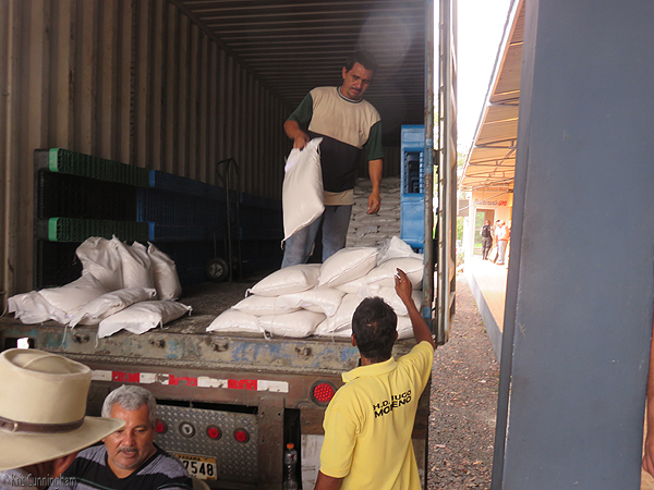 Bags of rice are unloaded from the truck to the waiting customers below.