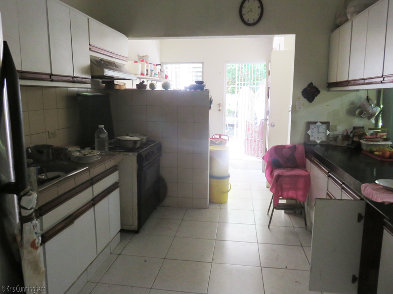 This is the spacious shared kitchen. There is a pass through space into the dining room, and beyond is the laundry area. There is no washing machine but there is a laundromat in the neighborhood.