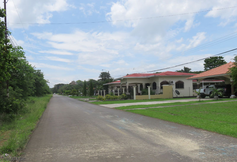 That is paint on the road. It seems the common way to dispose of paint is to put the can in the road and run over it. There are a few places where the paint can has become embedded in the asphalt, and it is common to see paint stains like this one. These are some of the pretty houses just outside our neighborhood.