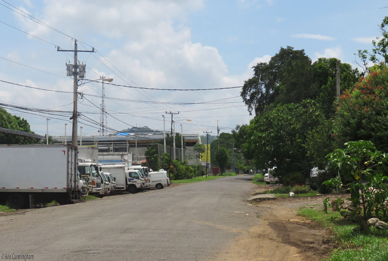 A little farther up the road is a distribution center, and the yellow bit is a part of a commercial center under construction beyond it. On the right are the car mechanics who have the calf staked out in various places where there is some grass for him to eat. Farther up on the right are more houses, and beyond the commercial center under construction is The American School.