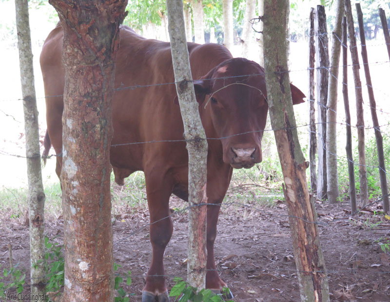 I stopped for a moment, looked up, and saw this young bull looking at me. Or, maybe he was looking at all the mangoes lying on the ground outside the fence.
