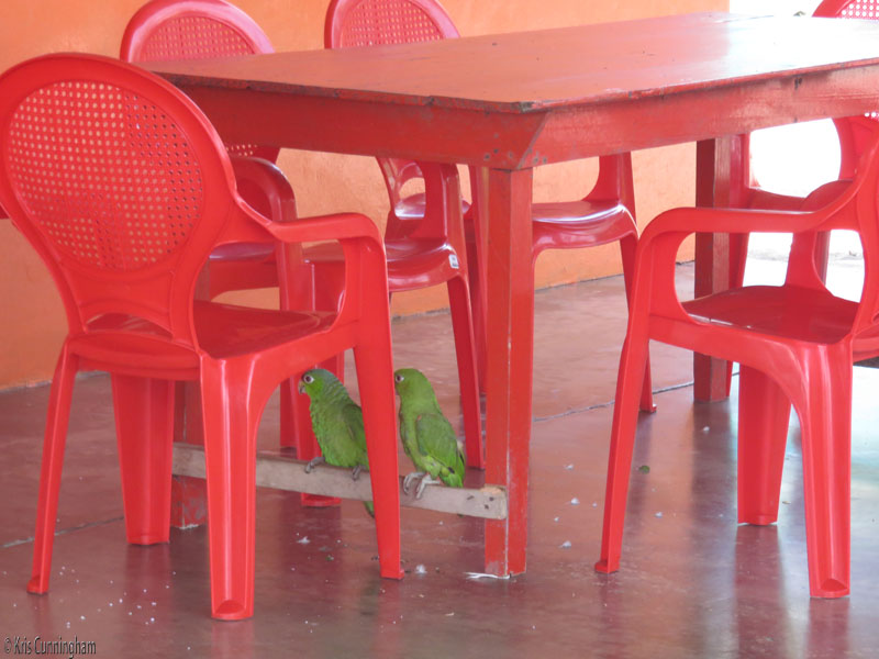 There is a little fonda on the beach where I stopped for a drink and a rest. These parrots were playing under a table.