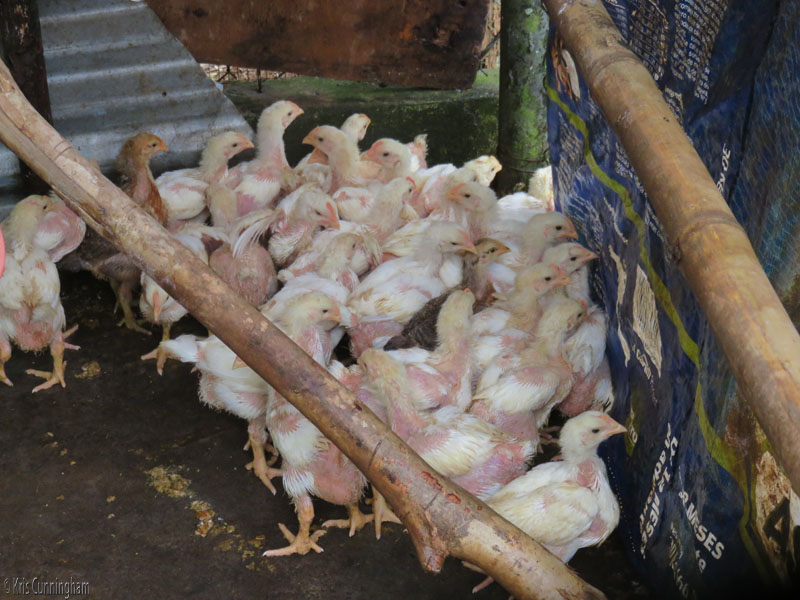 I visited the chickens one morning and they were all huddled in the corner to escape the water while their chicken house was being cleaned.