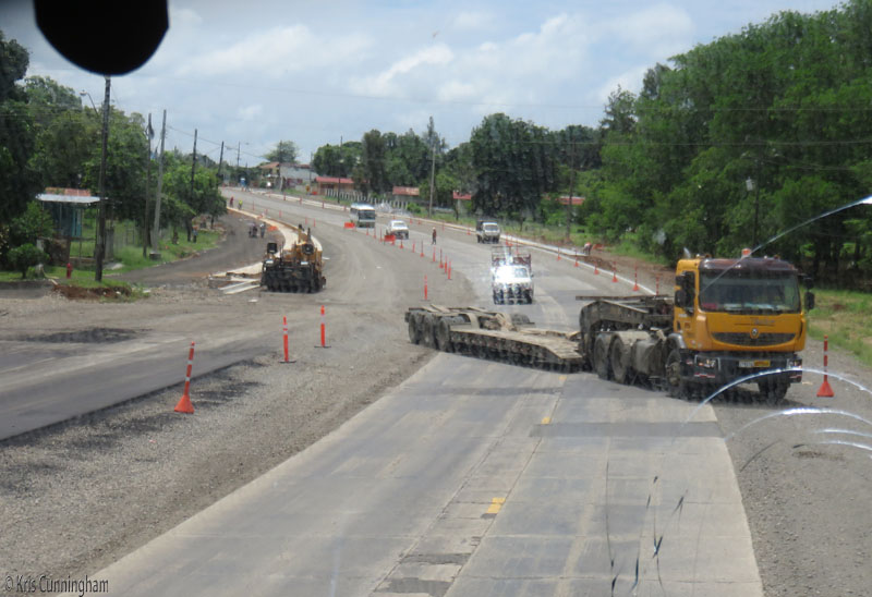 Sometimes traffic is routed on the old road, and sometimes on the new road. There is heavy equipment on the move which sometimes interrupts the flow of traffic.