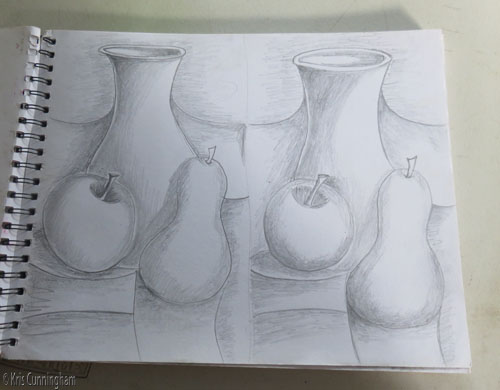 A still life – he drew part of the one on the left and I copied it on the right. This apple is a bit less funny looking than the last ones.