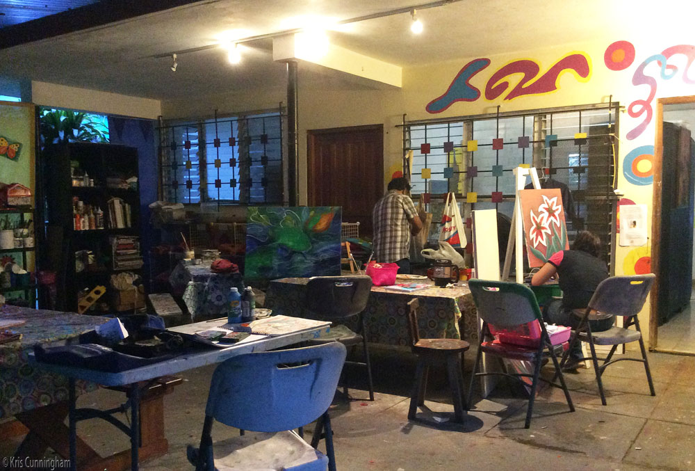 The professor is doing something along the back wall, and one of the adults works on her painting on the right.