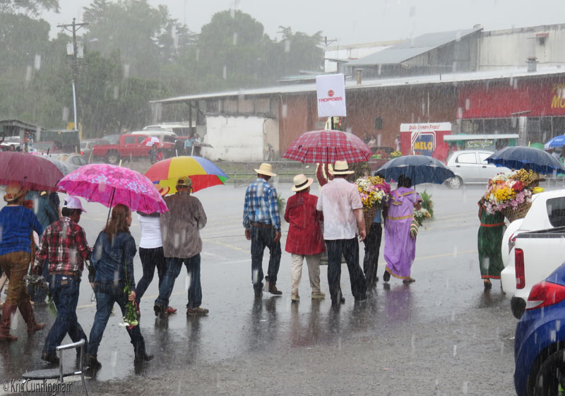 They pass us with umbrellas and baskets of flowers