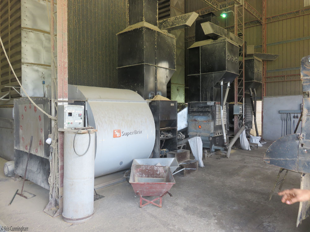 There was a fire in the middle machine. The guy said this was to dry out the rice. He explained that the rice went from one machine to another for various processes until finally being sent up the tubes.