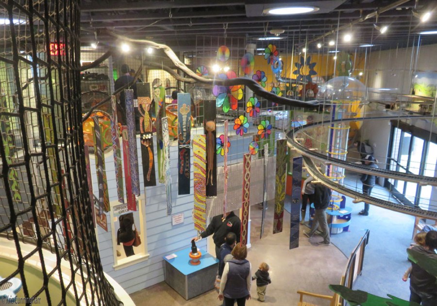 Look at all the colorful decorations, and the train tracks overhead. The black thing on the blue stand blows air and if you aim it right, you can balance a ball on the air stream.