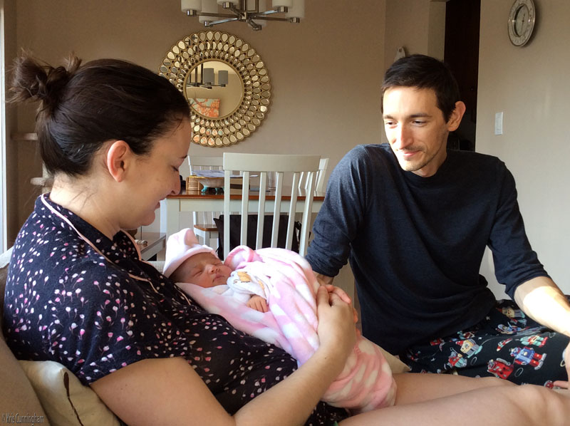 New parents, still a bit exhausted after a sleepless night in the hospital.