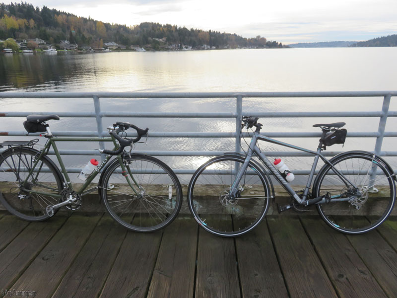 My son in law’s commuting bike is on the left, and my daughter’s bike is on the right, which she has been kind enough to let me borrow.