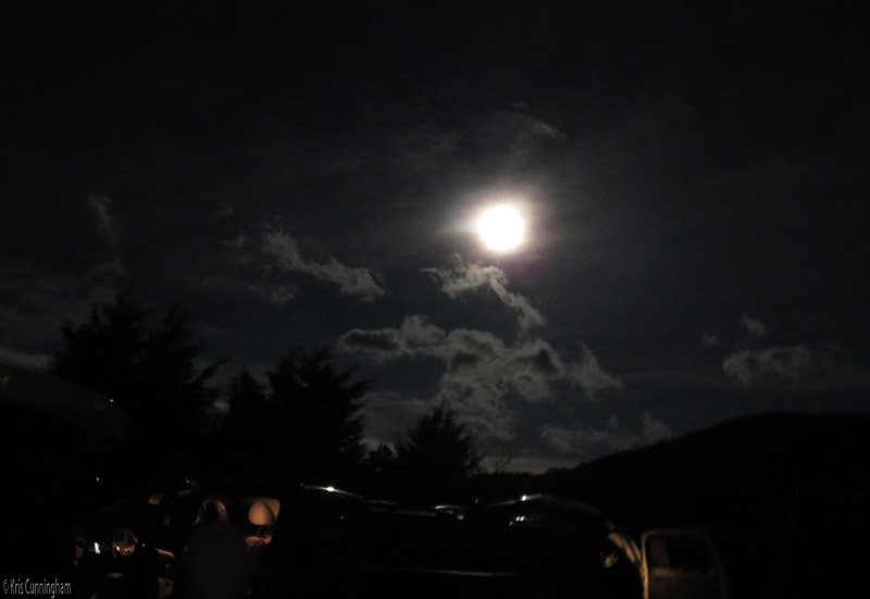 The moon shines over the mountains and clouds, and you can barely make out the friends at the full moon tailgate party below.