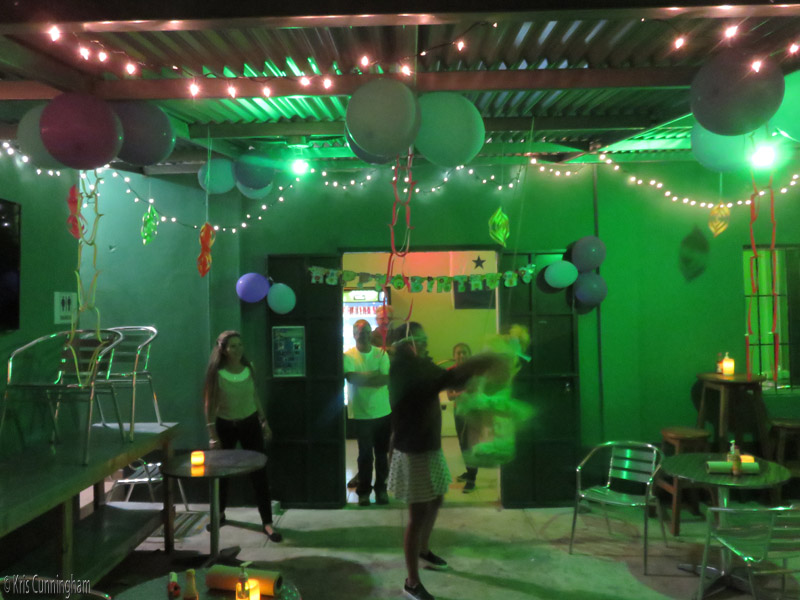 Then, the plan is to whack at the piñata with much enthusiasm! That is the birthday girl on the left. She is with Gary, the guy in the doorway with the white shirt, who is the bass player in one of Joel’s bands so this is how we all met.