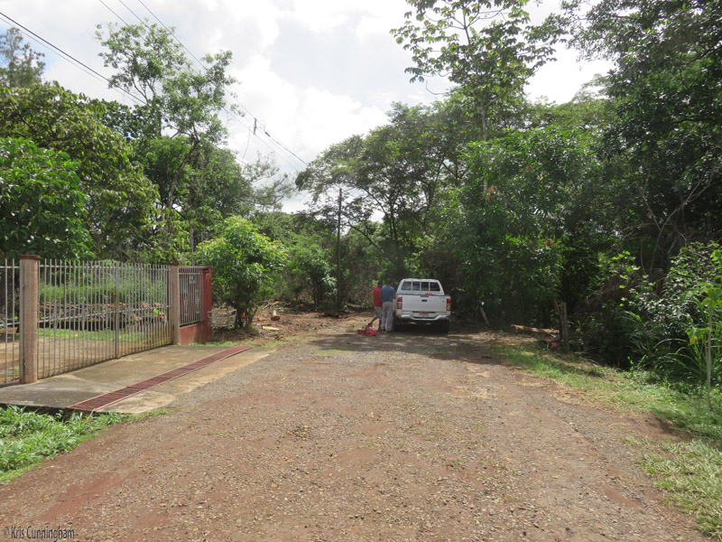 This is our street. I was standing more or less in front of our house which is on the right. The fence is in front of my across the street neighbor. The pine forest is behind and beyond her house. Straight ahead the road ends at the edge of a cliff. The teak trees are mostly down there next to the river.